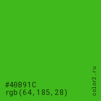 Цвет #40B91C в цветовой модели RGB обозначается тремя октетами (64, 185, 28) в десятичном формате и #40B91C в шестнадцатиричном (hex) формате, которые являются интенсивностью красного 64 (hex 40), интенсивность зелёного 185 (hex B9) и интенсивность синего 28 (hex 1C).