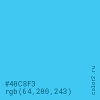 Цвет #40C8F3 в цветовой модели RGB обозначается тремя октетами (64, 200, 243) в десятичном формате и #40C8F3 в шестнадцатиричном (hex) формате, которые являются интенсивностью красного 64 (hex 40), интенсивность зелёного 200 (hex C8) и интенсивность синего 243 (hex F3).