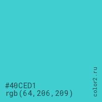 Цвет #40CED1 в цветовой модели RGB обозначается тремя октетами (64, 206, 209) в десятичном формате и #40CED1 в шестнадцатиричном (hex) формате, которые являются интенсивностью красного 64 (hex 40), интенсивность зелёного 206 (hex CE) и интенсивность синего 209 (hex D1).