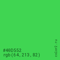 Цвет #40D552 в цветовой модели RGB обозначается тремя октетами (64, 213, 82) в десятичном формате и #40D552 в шестнадцатиричном (hex) формате, которые являются интенсивностью красного 64 (hex 40), интенсивность зелёного 213 (hex D5) и интенсивность синего 82 (hex 52).