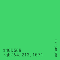 Цвет #40D56B в цветовой модели RGB обозначается тремя октетами (64, 213, 107) в десятичном формате и #40D56B в шестнадцатиричном (hex) формате, которые являются интенсивностью красного 64 (hex 40), интенсивность зелёного 213 (hex D5) и интенсивность синего 107 (hex 6B).