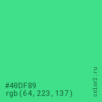 Цвет #40DF89 в цветовой модели RGB обозначается тремя октетами (64, 223, 137) в десятичном формате и #40DF89 в шестнадцатиричном (hex) формате, которые являются интенсивностью красного 64 (hex 40), интенсивность зелёного 223 (hex DF) и интенсивность синего 137 (hex 89).