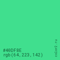 Цвет #40DF8E в цветовой модели RGB обозначается тремя октетами (64, 223, 142) в десятичном формате и #40DF8E в шестнадцатиричном (hex) формате, которые являются интенсивностью красного 64 (hex 40), интенсивность зелёного 223 (hex DF) и интенсивность синего 142 (hex 8E).