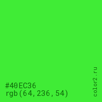 Цвет #40EC36 в цветовой модели RGB обозначается тремя октетами (64, 236, 54) в десятичном формате и #40EC36 в шестнадцатиричном (hex) формате, которые являются интенсивностью красного 64 (hex 40), интенсивность зелёного 236 (hex EC) и интенсивность синего 54 (hex 36).
