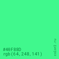 Цвет #40F88D в цветовой модели RGB обозначается тремя октетами (64, 248, 141) в десятичном формате и #40F88D в шестнадцатиричном (hex) формате, которые являются интенсивностью красного 64 (hex 40), интенсивность зелёного 248 (hex F8) и интенсивность синего 141 (hex 8D).