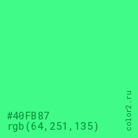 Цвет #40FB87 в цветовой модели RGB обозначается тремя октетами (64, 251, 135) в десятичном формате и #40FB87 в шестнадцатиричном (hex) формате, которые являются интенсивностью красного 64 (hex 40), интенсивность зелёного 251 (hex FB) и интенсивность синего 135 (hex 87).
