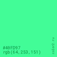 Цвет #40FD97 в цветовой модели RGB обозначается тремя октетами (64, 253, 151) в десятичном формате и #40FD97 в шестнадцатиричном (hex) формате, которые являются интенсивностью красного 64 (hex 40), интенсивность зелёного 253 (hex FD) и интенсивность синего 151 (hex 97).