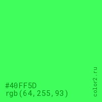 Цвет #40FF5D в цветовой модели RGB обозначается тремя октетами (64, 255, 93) в десятичном формате и #40FF5D в шестнадцатиричном (hex) формате, которые являются интенсивностью красного 64 (hex 40), интенсивность зелёного 255 (hex FF) и интенсивность синего 93 (hex 5D).