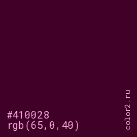 Цвет #410028 в цветовой модели RGB обозначается тремя октетами (65, 0, 40) в десятичном формате и #410028 в шестнадцатиричном (hex) формате, которые являются интенсивностью красного 65 (hex 41), интенсивность зелёного 0 (hex 00) и интенсивность синего 40 (hex 28).