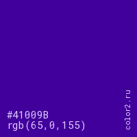 Цвет #41009B в цветовой модели RGB обозначается тремя октетами (65, 0, 155) в десятичном формате и #41009B в шестнадцатиричном (hex) формате, которые являются интенсивностью красного 65 (hex 41), интенсивность зелёного 0 (hex 00) и интенсивность синего 155 (hex 9B).