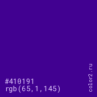 Цвет #410191 в цветовой модели RGB обозначается тремя октетами (65, 1, 145) в десятичном формате и #410191 в шестнадцатиричном (hex) формате, которые являются интенсивностью красного 65 (hex 41), интенсивность зелёного 1 (hex 01) и интенсивность синего 145 (hex 91).