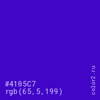 Цвет #4105C7 в цветовой модели RGB обозначается тремя октетами (65, 5, 199) в десятичном формате и #4105C7 в шестнадцатиричном (hex) формате, которые являются интенсивностью красного 65 (hex 41), интенсивность зелёного 5 (hex 05) и интенсивность синего 199 (hex C7).