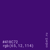 Цвет #410C72 в цветовой модели RGB обозначается тремя октетами (65, 12, 114) в десятичном формате и #410C72 в шестнадцатиричном (hex) формате, которые являются интенсивностью красного 65 (hex 41), интенсивность зелёного 12 (hex 0C) и интенсивность синего 114 (hex 72).