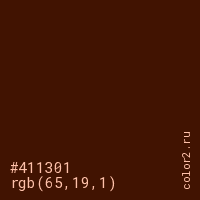 Цвет #411301 в цветовой модели RGB обозначается тремя октетами (65, 19, 1) в десятичном формате и #411301 в шестнадцатиричном (hex) формате, которые являются интенсивностью красного 65 (hex 41), интенсивность зелёного 19 (hex 13) и интенсивность синего 1 (hex 01).