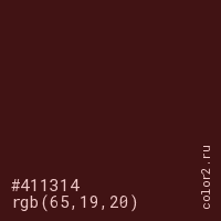 Цвет #411314 в цветовой модели RGB обозначается тремя октетами (65, 19, 20) в десятичном формате и #411314 в шестнадцатиричном (hex) формате, которые являются интенсивностью красного 65 (hex 41), интенсивность зелёного 19 (hex 13) и интенсивность синего 20 (hex 14).