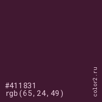 Цвет #411831 в цветовой модели RGB обозначается тремя октетами (65, 24, 49) в десятичном формате и #411831 в шестнадцатиричном (hex) формате, которые являются интенсивностью красного 65 (hex 41), интенсивность зелёного 24 (hex 18) и интенсивность синего 49 (hex 31).