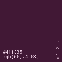 Цвет #411835 в цветовой модели RGB обозначается тремя октетами (65, 24, 53) в десятичном формате и #411835 в шестнадцатиричном (hex) формате, которые являются интенсивностью красного 65 (hex 41), интенсивность зелёного 24 (hex 18) и интенсивность синего 53 (hex 35).