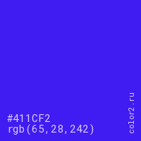 Цвет #411CF2 в цветовой модели RGB обозначается тремя октетами (65, 28, 242) в десятичном формате и #411CF2 в шестнадцатиричном (hex) формате, которые являются интенсивностью красного 65 (hex 41), интенсивность зелёного 28 (hex 1C) и интенсивность синего 242 (hex F2).