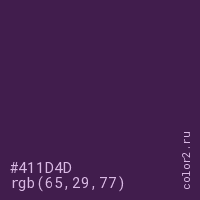 Цвет #411D4D в цветовой модели RGB обозначается тремя октетами (65, 29, 77) в десятичном формате и #411D4D в шестнадцатиричном (hex) формате, которые являются интенсивностью красного 65 (hex 41), интенсивность зелёного 29 (hex 1D) и интенсивность синего 77 (hex 4D).