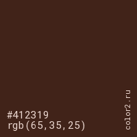 Цвет #412319 в цветовой модели RGB обозначается тремя октетами (65, 35, 25) в десятичном формате и #412319 в шестнадцатиричном (hex) формате, которые являются интенсивностью красного 65 (hex 41), интенсивность зелёного 35 (hex 23) и интенсивность синего 25 (hex 19).