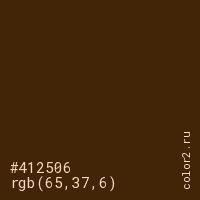 Цвет #412506 в цветовой модели RGB обозначается тремя октетами (65, 37, 6) в десятичном формате и #412506 в шестнадцатиричном (hex) формате, которые являются интенсивностью красного 65 (hex 41), интенсивность зелёного 37 (hex 25) и интенсивность синего 6 (hex 06).
