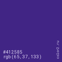 Цвет #412585 в цветовой модели RGB обозначается тремя октетами (65, 37, 133) в десятичном формате и #412585 в шестнадцатиричном (hex) формате, которые являются интенсивностью красного 65 (hex 41), интенсивность зелёного 37 (hex 25) и интенсивность синего 133 (hex 85).