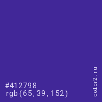 Цвет #412798 в цветовой модели RGB обозначается тремя октетами (65, 39, 152) в десятичном формате и #412798 в шестнадцатиричном (hex) формате, которые являются интенсивностью красного 65 (hex 41), интенсивность зелёного 39 (hex 27) и интенсивность синего 152 (hex 98).