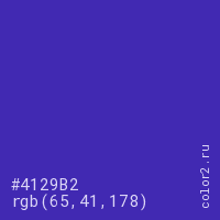Цвет #4129B2 в цветовой модели RGB обозначается тремя октетами (65, 41, 178) в десятичном формате и #4129B2 в шестнадцатиричном (hex) формате, которые являются интенсивностью красного 65 (hex 41), интенсивность зелёного 41 (hex 29) и интенсивность синего 178 (hex B2).