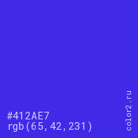 Цвет #412AE7 в цветовой модели RGB обозначается тремя октетами (65, 42, 231) в десятичном формате и #412AE7 в шестнадцатиричном (hex) формате, которые являются интенсивностью красного 65 (hex 41), интенсивность зелёного 42 (hex 2A) и интенсивность синего 231 (hex E7).