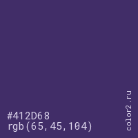 Цвет #412D68 в цветовой модели RGB обозначается тремя октетами (65, 45, 104) в десятичном формате и #412D68 в шестнадцатиричном (hex) формате, которые являются интенсивностью красного 65 (hex 41), интенсивность зелёного 45 (hex 2D) и интенсивность синего 104 (hex 68).