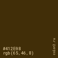 Цвет #412E08 в цветовой модели RGB обозначается тремя октетами (65, 46, 8) в десятичном формате и #412E08 в шестнадцатиричном (hex) формате, которые являются интенсивностью красного 65 (hex 41), интенсивность зелёного 46 (hex 2E) и интенсивность синего 8 (hex 08).