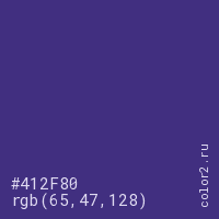 Цвет #412F80 в цветовой модели RGB обозначается тремя октетами (65, 47, 128) в десятичном формате и #412F80 в шестнадцатиричном (hex) формате, которые являются интенсивностью красного 65 (hex 41), интенсивность зелёного 47 (hex 2F) и интенсивность синего 128 (hex 80).