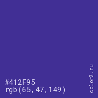 Цвет #412F95 в цветовой модели RGB обозначается тремя октетами (65, 47, 149) в десятичном формате и #412F95 в шестнадцатиричном (hex) формате, которые являются интенсивностью красного 65 (hex 41), интенсивность зелёного 47 (hex 2F) и интенсивность синего 149 (hex 95).