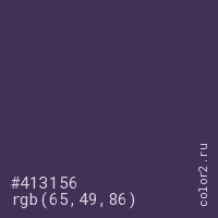 Цвет #413156 в цветовой модели RGB обозначается тремя октетами (65, 49, 86) в десятичном формате и #413156 в шестнадцатиричном (hex) формате, которые являются интенсивностью красного 65 (hex 41), интенсивность зелёного 49 (hex 31) и интенсивность синего 86 (hex 56).