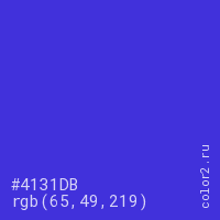 Цвет #4131DB в цветовой модели RGB обозначается тремя октетами (65, 49, 219) в десятичном формате и #4131DB в шестнадцатиричном (hex) формате, которые являются интенсивностью красного 65 (hex 41), интенсивность зелёного 49 (hex 31) и интенсивность синего 219 (hex DB).