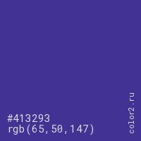 Цвет #413293 в цветовой модели RGB обозначается тремя октетами (65, 50, 147) в десятичном формате и #413293 в шестнадцатиричном (hex) формате, которые являются интенсивностью красного 65 (hex 41), интенсивность зелёного 50 (hex 32) и интенсивность синего 147 (hex 93).