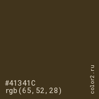 Цвет #41341C в цветовой модели RGB обозначается тремя октетами (65, 52, 28) в десятичном формате и #41341C в шестнадцатиричном (hex) формате, которые являются интенсивностью красного 65 (hex 41), интенсивность зелёного 52 (hex 34) и интенсивность синего 28 (hex 1C).