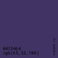 Цвет #413464 в цветовой модели RGB обозначается тремя октетами (65, 52, 100) в десятичном формате и #413464 в шестнадцатиричном (hex) формате, которые являются интенсивностью красного 65 (hex 41), интенсивность зелёного 52 (hex 34) и интенсивность синего 100 (hex 64).