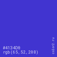 Цвет #4134D0 в цветовой модели RGB обозначается тремя октетами (65, 52, 208) в десятичном формате и #4134D0 в шестнадцатиричном (hex) формате, которые являются интенсивностью красного 65 (hex 41), интенсивность зелёного 52 (hex 34) и интенсивность синего 208 (hex D0).
