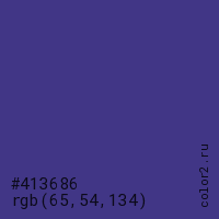 Цвет #413686 в цветовой модели RGB обозначается тремя октетами (65, 54, 134) в десятичном формате и #413686 в шестнадцатиричном (hex) формате, которые являются интенсивностью красного 65 (hex 41), интенсивность зелёного 54 (hex 36) и интенсивность синего 134 (hex 86).