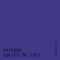 Цвет #413888 в цветовой модели RGB обозначается тремя октетами (65, 56, 136) в десятичном формате и #413888 в шестнадцатиричном (hex) формате, которые являются интенсивностью красного 65 (hex 41), интенсивность зелёного 56 (hex 38) и интенсивность синего 136 (hex 88).