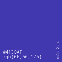 Цвет #4138AF в цветовой модели RGB обозначается тремя октетами (65, 56, 175) в десятичном формате и #4138AF в шестнадцатиричном (hex) формате, которые являются интенсивностью красного 65 (hex 41), интенсивность зелёного 56 (hex 38) и интенсивность синего 175 (hex AF).