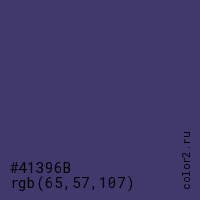 Цвет #41396B в цветовой модели RGB обозначается тремя октетами (65, 57, 107) в десятичном формате и #41396B в шестнадцатиричном (hex) формате, которые являются интенсивностью красного 65 (hex 41), интенсивность зелёного 57 (hex 39) и интенсивность синего 107 (hex 6B).