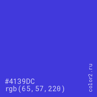 Цвет #4139DC в цветовой модели RGB обозначается тремя октетами (65, 57, 220) в десятичном формате и #4139DC в шестнадцатиричном (hex) формате, которые являются интенсивностью красного 65 (hex 41), интенсивность зелёного 57 (hex 39) и интенсивность синего 220 (hex DC).