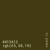 Цвет #413A12 в цветовой модели RGB обозначается тремя октетами (65, 58, 18) в десятичном формате и #413A12 в шестнадцатиричном (hex) формате, которые являются интенсивностью красного 65 (hex 41), интенсивность зелёного 58 (hex 3A) и интенсивность синего 18 (hex 12).
