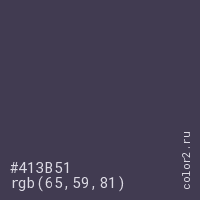 Цвет #413B51 в цветовой модели RGB обозначается тремя октетами (65, 59, 81) в десятичном формате и #413B51 в шестнадцатиричном (hex) формате, которые являются интенсивностью красного 65 (hex 41), интенсивность зелёного 59 (hex 3B) и интенсивность синего 81 (hex 51).