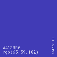 Цвет #413BB6 в цветовой модели RGB обозначается тремя октетами (65, 59, 182) в десятичном формате и #413BB6 в шестнадцатиричном (hex) формате, которые являются интенсивностью красного 65 (hex 41), интенсивность зелёного 59 (hex 3B) и интенсивность синего 182 (hex B6).