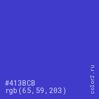 Цвет #413BCB в цветовой модели RGB обозначается тремя октетами (65, 59, 203) в десятичном формате и #413BCB в шестнадцатиричном (hex) формате, которые являются интенсивностью красного 65 (hex 41), интенсивность зелёного 59 (hex 3B) и интенсивность синего 203 (hex CB).