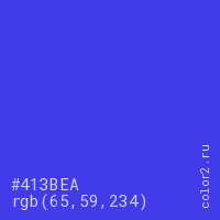 Цвет #413BEA в цветовой модели RGB обозначается тремя октетами (65, 59, 234) в десятичном формате и #413BEA в шестнадцатиричном (hex) формате, которые являются интенсивностью красного 65 (hex 41), интенсивность зелёного 59 (hex 3B) и интенсивность синего 234 (hex EA).