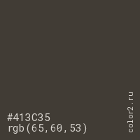 Цвет #413C35 в цветовой модели RGB обозначается тремя октетами (65, 60, 53) в десятичном формате и #413C35 в шестнадцатиричном (hex) формате, которые являются интенсивностью красного 65 (hex 41), интенсивность зелёного 60 (hex 3C) и интенсивность синего 53 (hex 35).